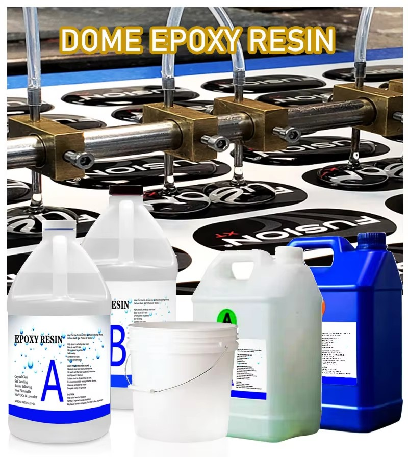 FEATURES Our Epoxy Doming Resin has the advantage below: 1. Good self-leveling performance 2. High glossy and transparency 3. Excellent yellowing and UV resistance 4. No shrinkage and shelling 5. Excellent fracture resistance 6. No harden, breakage and shrinkage after long time using. 7. Low viscosity and good flowing property after mixing.