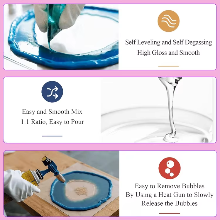 ---- Can be cured 100% at normal temperature or by heating. ---- High Gloss , Clear, Impact Strength, Water Resistant, self leveling. ---- Yellow resistant when exposed to sunlight for a long time. ---- Easy to operating and Excellent Air Release. ---- Excellent Color Stability, can use any pigment you want to add. ---- Early Development of Physical and Performance Properties ---- No ripple,bright in surface,odorless,eco-friendly,nontoxic,waterproof and so on. ---- Easy to clean and repair.