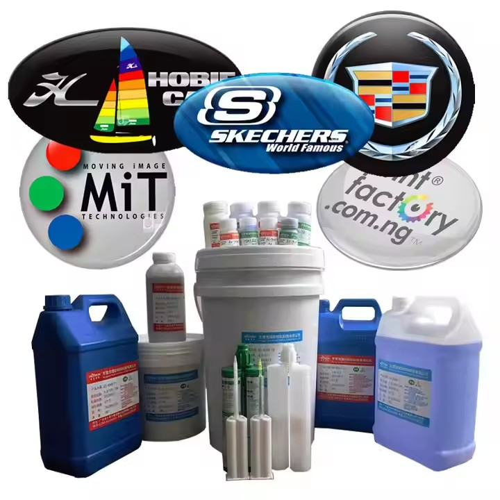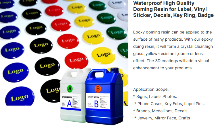 FEATURES Our Epoxy Doming Resin has the advantage below: 1. Good self-leveling performance 2. High glossy and transparency 3. Excellent yellowing and UV resistance 4. No shrinkage and shelling 5. Excellent fracture resistance 6. No harden, breakage and shrinkage after long time using. 7. Low viscosity and good flowing property after mixing.